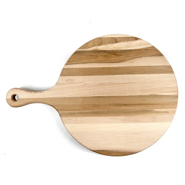 Show off your pizza-cutting skills with this stylish pizza-cutting board featuring a handle. Crafted from earth-friendly and renewable maple wood, this hardwood pizza-cutting board with handle features a superlative wood grain with grooves around the edge, completing this beautiful board. It would make a perfect addition to any kitchen. Ideal for both personal and professional use, it will definitely impress all the pizza lovers out there. This cutting board is made out of maple hardwood and is Canadian.